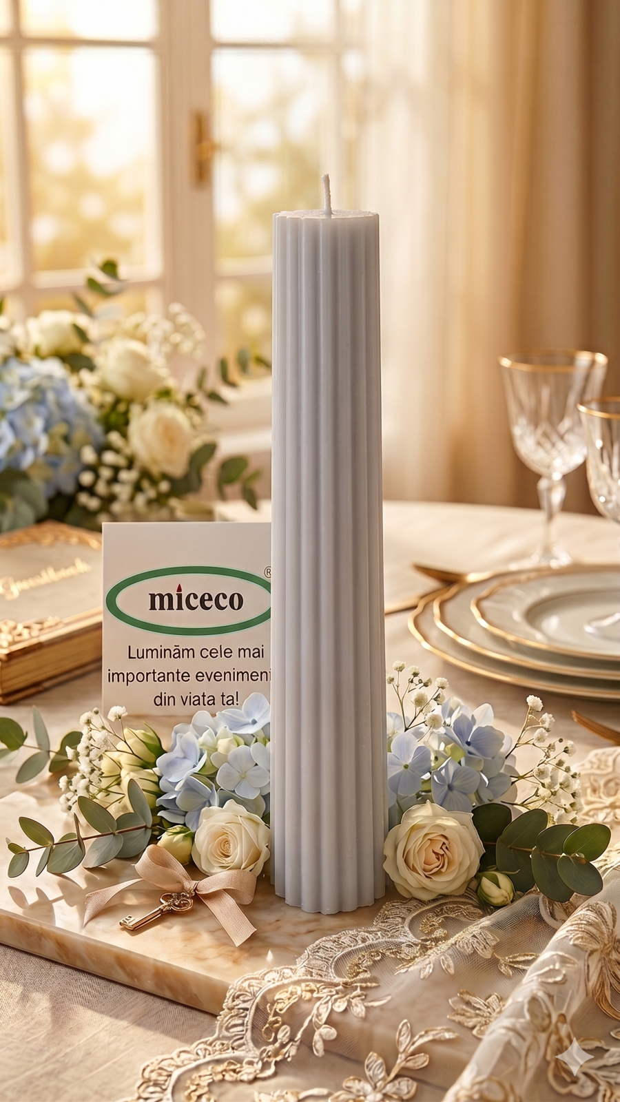 O lumânare artizanală cu o formă conică distinctivă și textură canelată, creată special pentru a completa atmosfera momentelor unice.